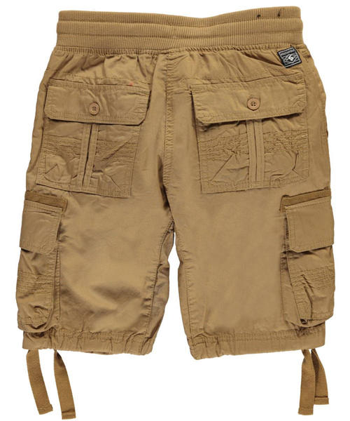 He has a green T-shirt and a pair of brown shorts.